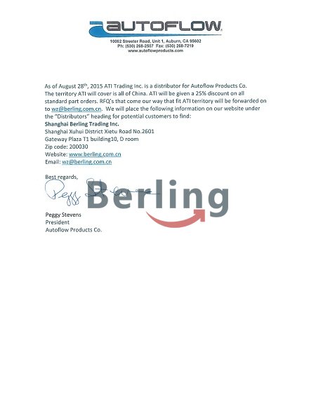 美國AUTOFLOW公司于2015年8月28日授權我公司為中國區(qū)代理