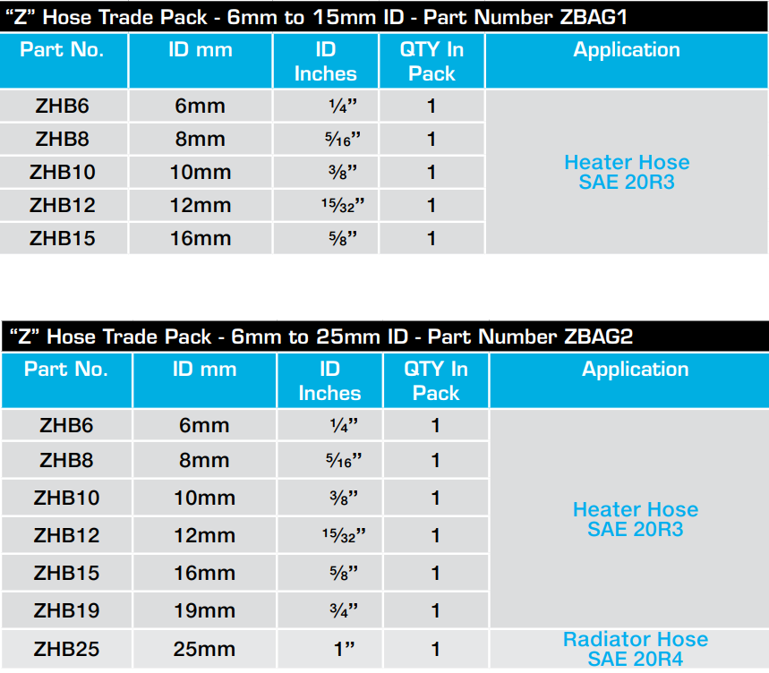 ZBAG1由一根頂部5“Z”的水管組成,特別適合作為入門級或車間補充庫存包。ZBAG2包含額外的大內(nèi)徑19mm和25mm軟管。